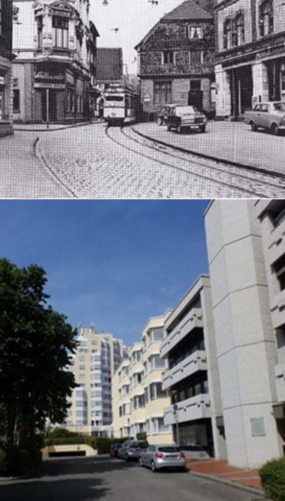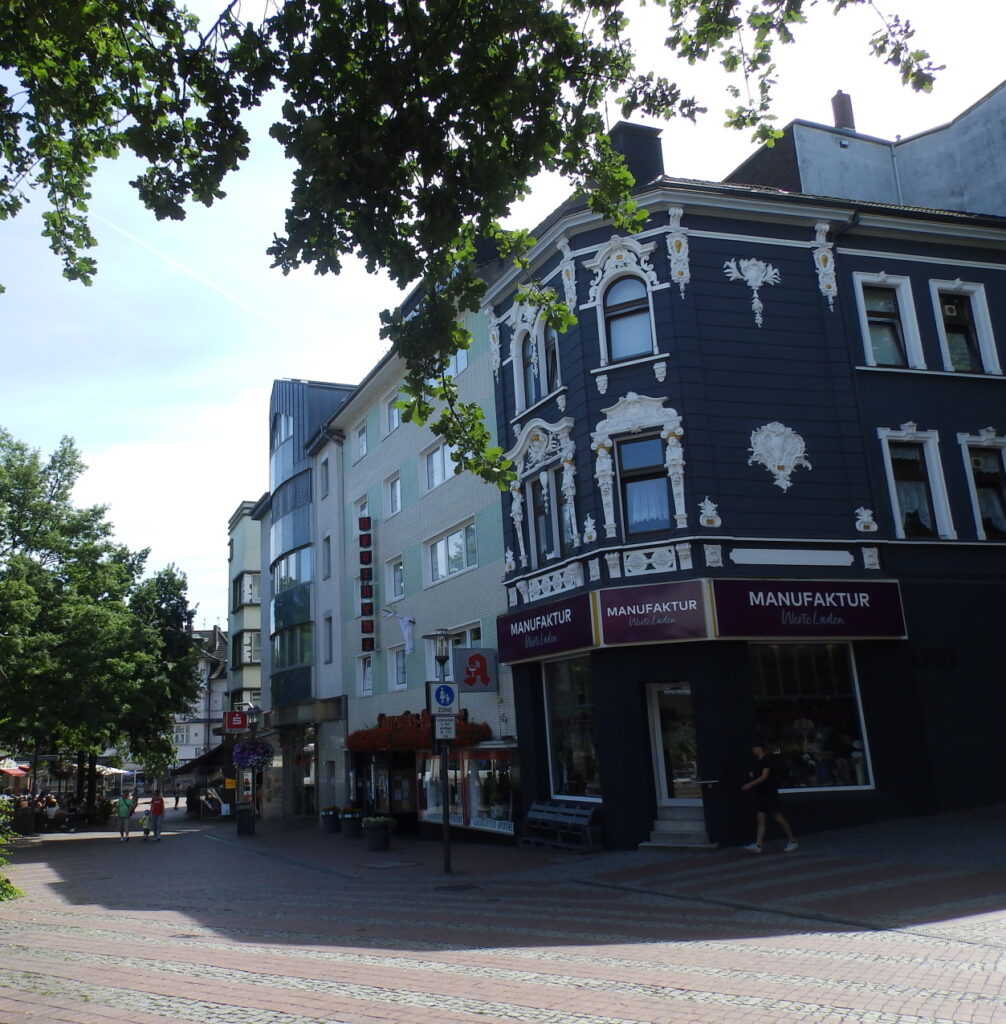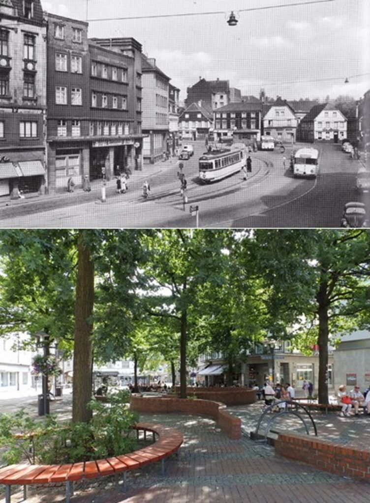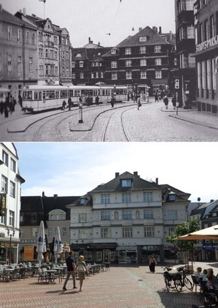 Die städtische Baustruktur der Innenstadt wird dominiert von alten Fachwerkhäusern und Gebäuden aus der Zeit um das 19te Jahrhundert. Unmittelbar vom Zentrum nach Osten angrenzend ist ein modern, architektonisch nett gebauter Wohnbereich. Dieser ist in den 60er und 70er Jahren im Rahmen einer großen Umstrukturierung entstanden. Dazu hatte man großräumig Straßenzüge und die Bahnlinie abgerissen und neugestaltet. Die folgenden Fotos zeigen wie es war und wie es jetzt ist.